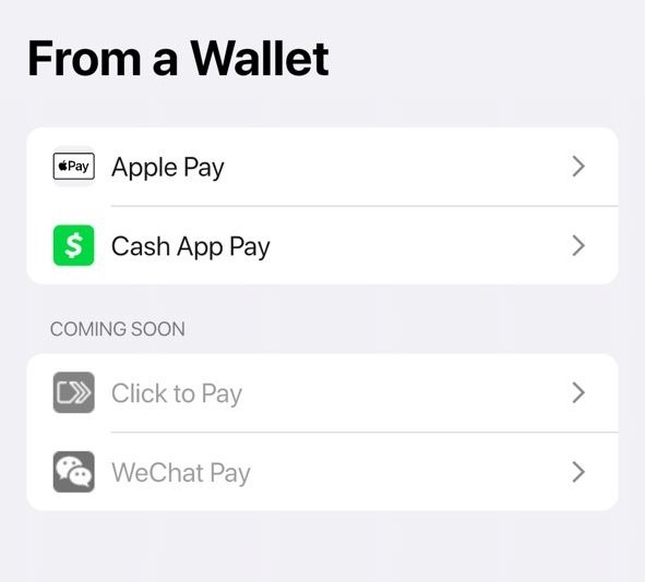 Ақшаны алу үшін Cash App Pay, барыңыз Қабылдау бөлімін таңдап, түймесін түртіңіз әмияннан опция.