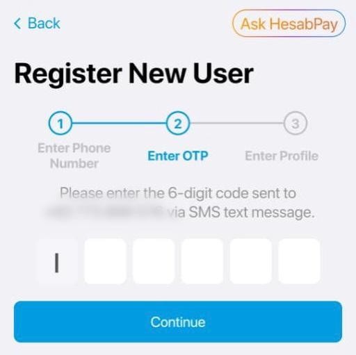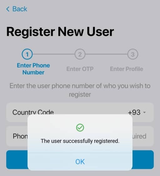 Mamlakat kodini tanlang, foydalanuvchining telefon raqamini kiriting va ga teging Davom eting tugmasi.