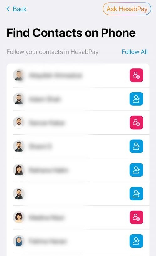 Ushbu sahifada siz allaqachon HasapPay-dan foydalanayotgan barcha kontaktlarni ko'rishingiz va ularning profillarini kuzatishingiz mumkin.