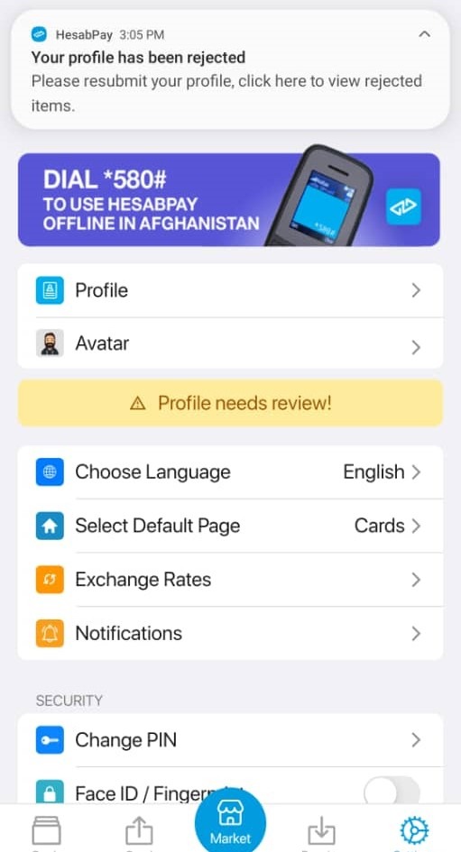 Agar sizning hisobingiz bo'lsa Rad etilgan, hisobingiz HisobPay jamoasi tomonidan ko'rib chiqilishi va tasdiqlanishi uchun profil ma'lumotlarini qayta yuklashingiz va hisobni tekshirish uchun so'rovingizni yuborishingiz kerak bo'ladi.